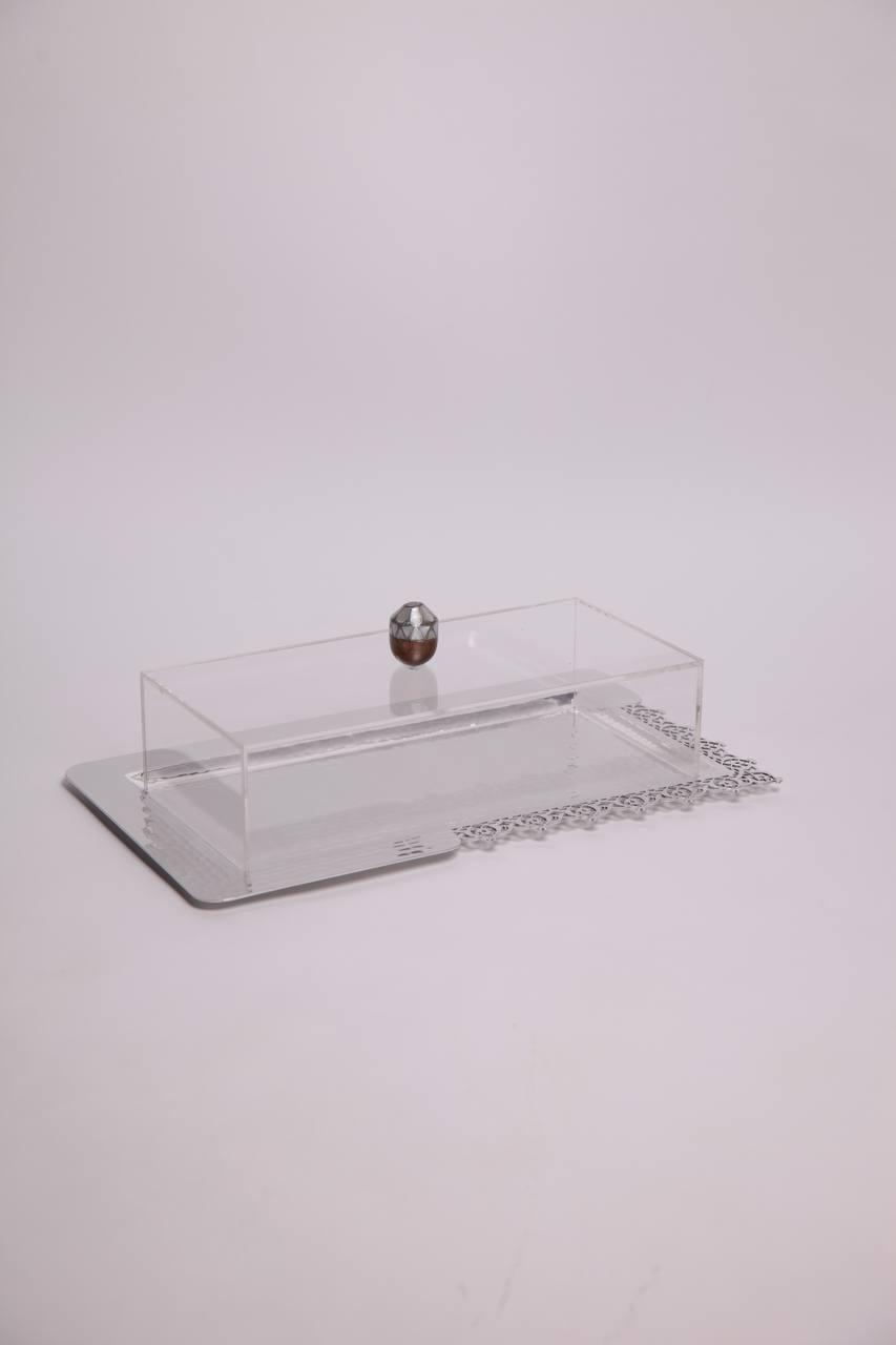 صينية معدنية مستطيلة الشكل بنقشة دانتيل وغطاء من البليكسي جلاس، مقاس 1