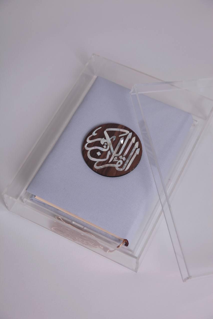 قرآن صغير أزرق اللون مع مصدفة خشبية مستديرة